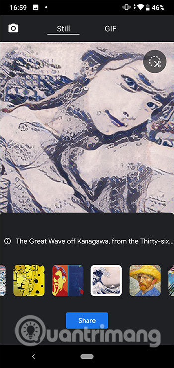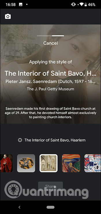 Sau đó hiển thị giao diện để chúng ta chụp hình hoặc sử dụng hình ảnh có sẵn. Có rất nhiều trường phái hội họa khác nhau để chúng ta sử dụng cho từng hình ảnh sao cho phù hợp. Bạn lựa chọn kiểu bộ lọc ảnh nghệ thuật muốn sử dụng cho hình ảnh của mình.