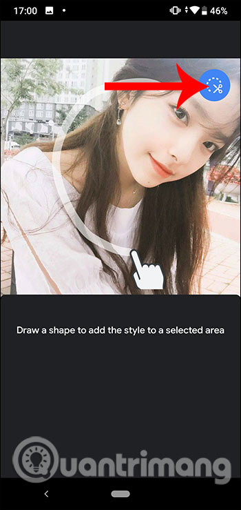 Để chọn vùng riêng muốn áp dụng bộ lọc hình ảnh, chúng ta nhấn vào biểu tượng cây kéo rồi khoanh tròn vùng lại. Sau đó cũng sẽ có các bộ lọc để chúng ta lựa chọn sử dụng cho vùng ảnh đã chọn đó. Kết quả chỉ vùng ảnh đã chọn thay đổi, vùng ảnh khác vẫn giữ nguyên màu ảnh gốc.