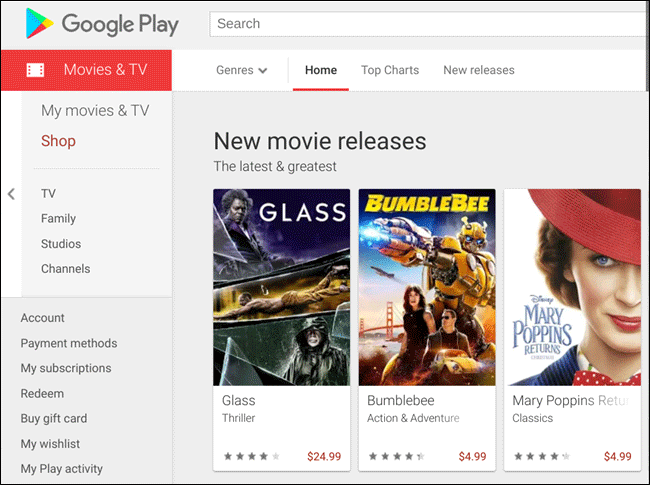 Bạn có thể truy cập Play Movies từ Chrome qua trang web https://play.google.com/store/movies. Cửa hàng trực tuyến này cho phép bạn tìm kiếm, duyệt, xem trailer, mua/thuê phim.