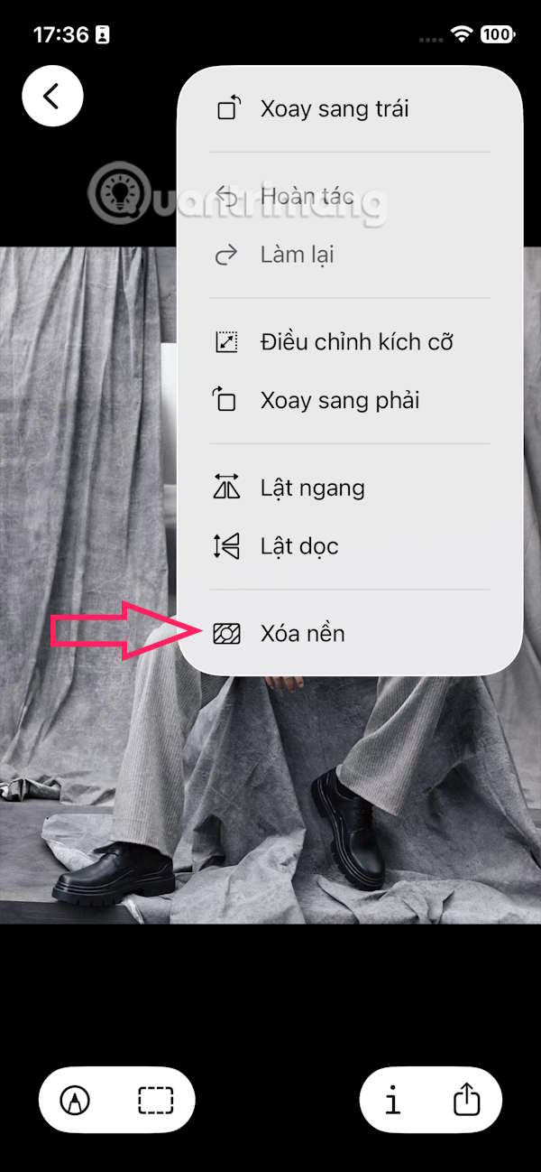 Hiển thị menu tùy chỉnh cho những hình nền, người dùng nhấn chọn tiếp vào tùy chọn Xóa nền trong menu hiển thị.