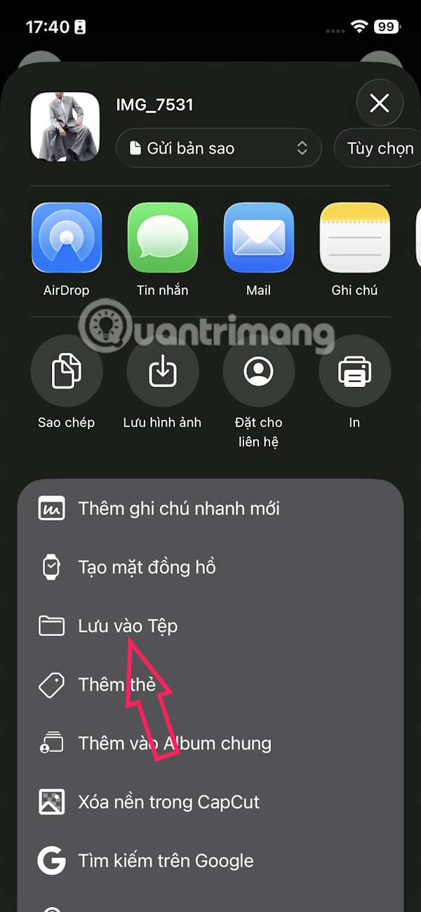 Mở album trên iPhone sau đó nhấn chọn vào những hình ảnh mà bạn muốn xóa nền ảnh. Sau đó ấn tiếp vào biểu tượng menu 3 dấu chấm ở góc dưới bên phải màn hình. Tiếp tục người dùng nhấn chọn vào mục Lưu vào Tệp.