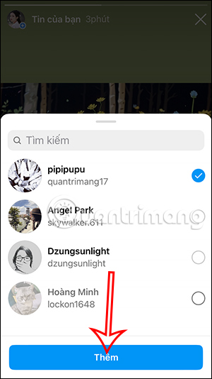 Hiển thị giao diện tài khoản Instagram bạn bè của bạn. Chúng ta nhấn vào tài khoản Instagram muốn tag vào Story đã đăng. Bạn nhập tên của họ vào thanh tìm kiếm để tìm nhanh hơn. Sau đó nhấn vào tên tài khoản Instagram tag vào Story rồi nhấn Thêm ở bên dưới để tag họ.