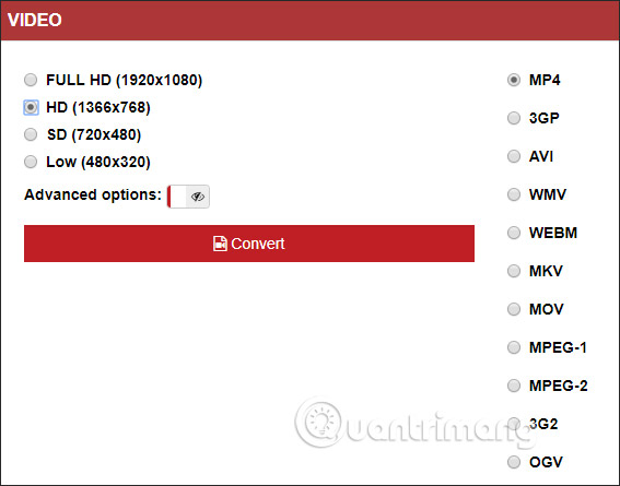Trang web hỗ trợ đổi định dạng video với các định dạng phổ biến như 3GP, AVI, WMV,.. và lựa chọn chất lượng video khác nhau.
