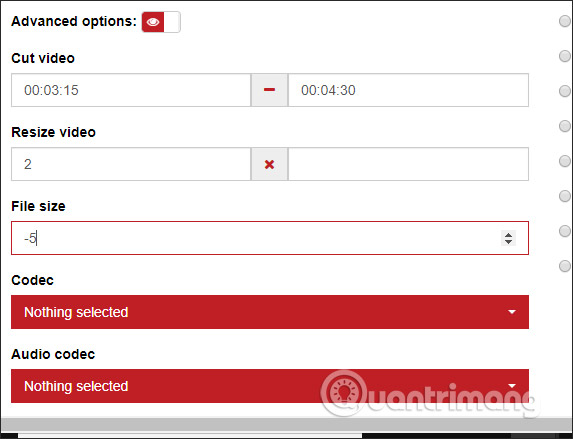 Bên dưới khi kích hoạt vào Advanced options bạn sẽ có thêm tùy chọn cắt video và chỉnh chất lượng video đầu ra. Với phần chọn đoạn video muốn cắt người dùng phải nhập trực tiếp thời gian.