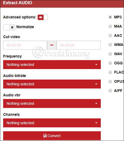 Nếu muốn chuyển video sang file âm thanh thì tại phần Audio chúng ta cũng chọn định dạng âm thanh cho video và thêm một số tùy chỉnh nâng cao khác. Sau khi đã thiết lập xong cho mục đích chuyển đổi video nhấn nút Convert bên dưới.