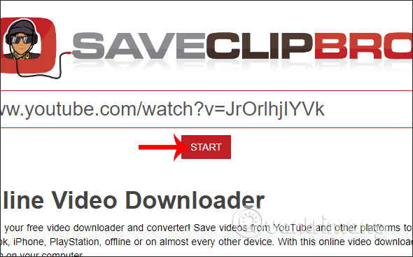 Người dùng nhấn vào link dưới đây để vào trang chủ của SaveClipBro. Tại giao diện nhập URL video YouTube rồi nhấn nút Start để tải video lên hệ thống trang chủ.