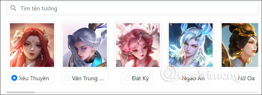 Trong giao diện này người dùng sẽ tìm tên tướng mà mình thích. Có thể kéo thanh ngang sang trái hoặc sang phải, hay nhập tên tướng vào thanh tìm kiếm để tìm nhanh hơn.