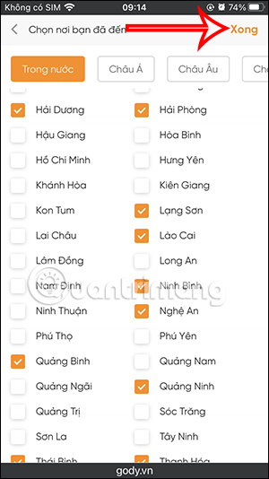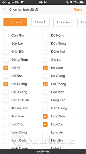 Tiếp đến bạn sẽ nhập nơi mình sinh ra, tích chọn những nơi mình đã đến trên khắp đất nước Việt Nam. Chọn nơi đã đi xong thì bạn nhấn vào nút Xong để lưu lại vào tạo bản đồ du lịch.
