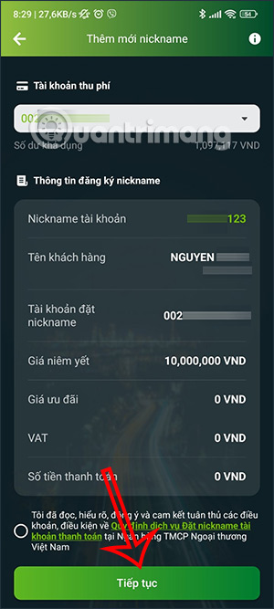 Khi đó sẽ hiển thị thông tin nickname cho tài khoản Vietcombank. Bạn kiểm tra lại thông tin xem đã đúng chưa, sau đó tích chọn vào điều khoản của ứng dụng rồi nhấn Tiếp tục ở bên dưới.