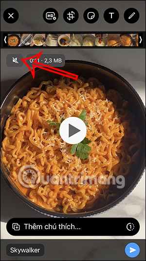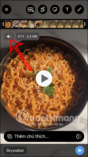 Trong giao diện chỉnh sửa video trên Whatsapp bạn sẽ nhìn thấy biểu tượng loa để tắt âm thanh video này nếu muốn. Chúng ta chỉ cần nhấn vào biểu tượng loa để tắt âm thanh video là được. Lúc này bạn sẽ nhìn thấy biểu tượng loa gạch chéo đã tắt âm thanh.