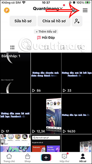 Đầu tiên chúng ta nhấn vào mục Hồ sơ để truy cập vào giao diện TikTok cá nhân của bạn. Tiếp đến trong giao diện TikTok cá nhân, người dùng nhấn vào biểu tượng 3 dấu gạch ngang ở góc phải trên cùng màn hình.