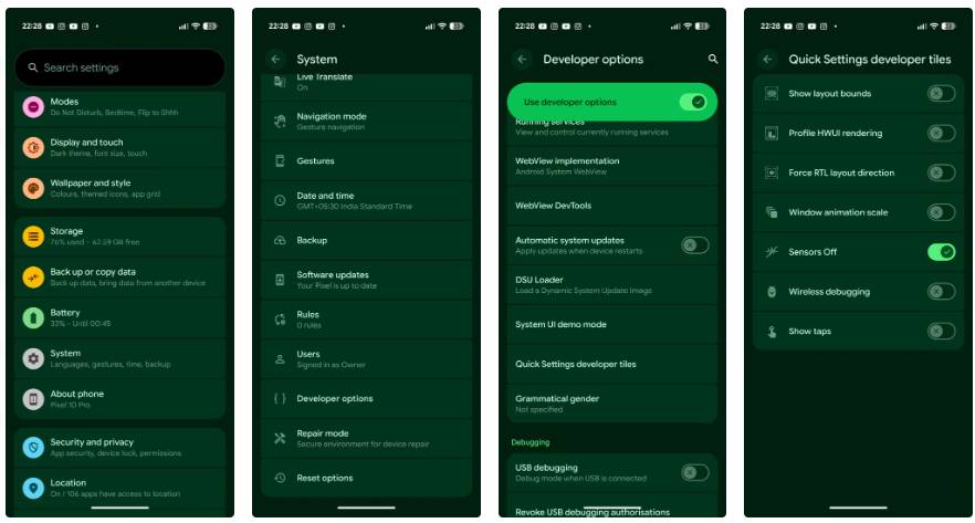 Sau khi hoàn tất, hãy mở lại ứng dụng Settings và vào System, sau đó nhấn vào Developer Options. Cuộn đến Quick Settings, developer options và bật Sensors Off. Tile Sensors Off giờ sẽ xuất hiện trong Quick Settings, cho phép bạn bật hoặc tắt bất cứ khi nào cần.
