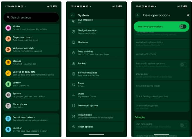 Mặt khác, nếu bạn muốn tắt Developer Options trên điện thoại, hãy mở ứng dụng Settings, vào System, rồi nhấn Developer Options. Từ đó, tắt công tắc Use Developer Options.