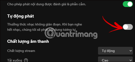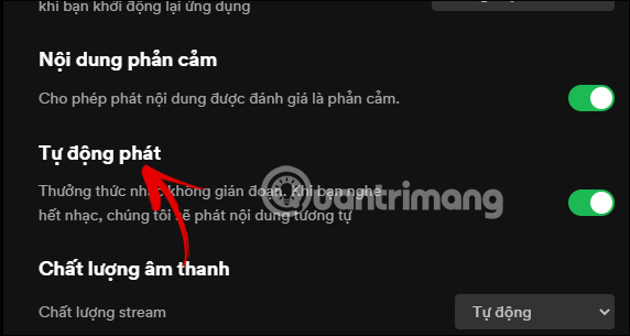 Hiển thị giao diện các tùy chỉnh nghe nhạc trên Spotify. Tại đây bạn sẽ thấy tùy chỉnh Tự động phát để chỉnh lại chế độ phát nhạc tự động trên Spotify.