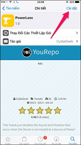 Tiếp đến nhấn vào tab Tìm kiếm rồi nhập từ khóa PowerLess để tìm kiếm tweak PowerLess. Sau đó người dùng tiến hành cài đặt tweak PowerLess trên thiết bị. Tiến hành khởi động lại SpringBoard là xong.