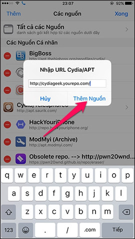 Bạn mở ứng dụng Cydia rồi nhấn vào tab Nguồn. Nhấn vào nút Thêm bên trên và thêm nguồn https://cydiageek.yourepo.com/ trong thanh ngang. Nhấn nút Thêm nguồn bên dưới. Sau đó nhấn vào nút Trở lại Cydia.