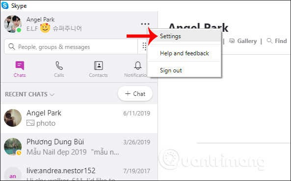 Người dùng truy cập vào tài khoản Skype cá nhân. Tại giao diện chúng ta nhấn chọn vào biểu tượng 3 dấu chấm rồi chọn Settings.