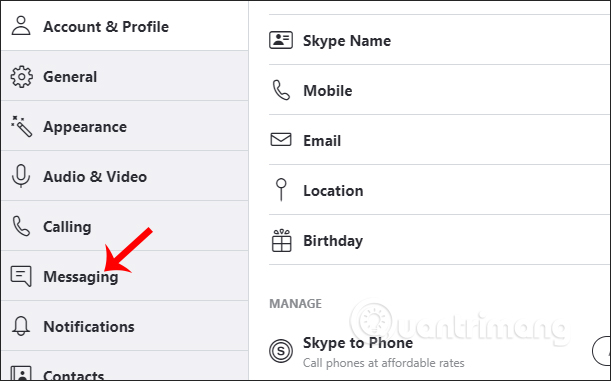 Hiển thị giao diện thiết lập tài khoản và giao diện Skype. Tại đây người dùng nhấn chọn vào nhóm Messaging ở cột danh sách bên trái màn hình.