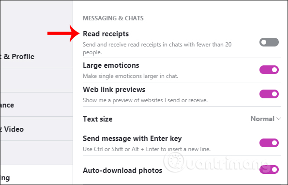 Nhìn sang nội dung bên phải chúng ta sẽ thấy tùy chọn Read receipts để tắt hoặc bật chế độ đã xem tin nhắn khi đọc tin nhắn của người khác. Bạn chuyển nút tròn về bên trái để tắt chế độ Read receipts này. Như vậy người khác không biết bạn đã đọc tin nhắn họ gửi đến hay chưa.