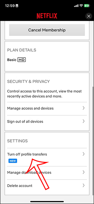 Chuyển sang giao diện mới, người dùng nhấn chọn vào mục Account để điều chỉnh tài khoản. Tại đây chúng ta sẽ thấy các thiết lập cho tài khoản Netflix của bạn. Người dùng nhấn chọn vào Turn Off Profile Transfer.