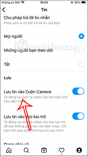 Trong danh sách các mục thiết lập cho Story Instagram bạn sẽ nhìn thấy tùy chọn Lưu tin vào Cuộn Camera. Chúng ta sẽ tắt chế độ tự động lưu tin Story vào album trên điện thoại đi, bao gồm hình ảnh và video để không làm đầy dung lượng bộ nhớ trên điện thoại.