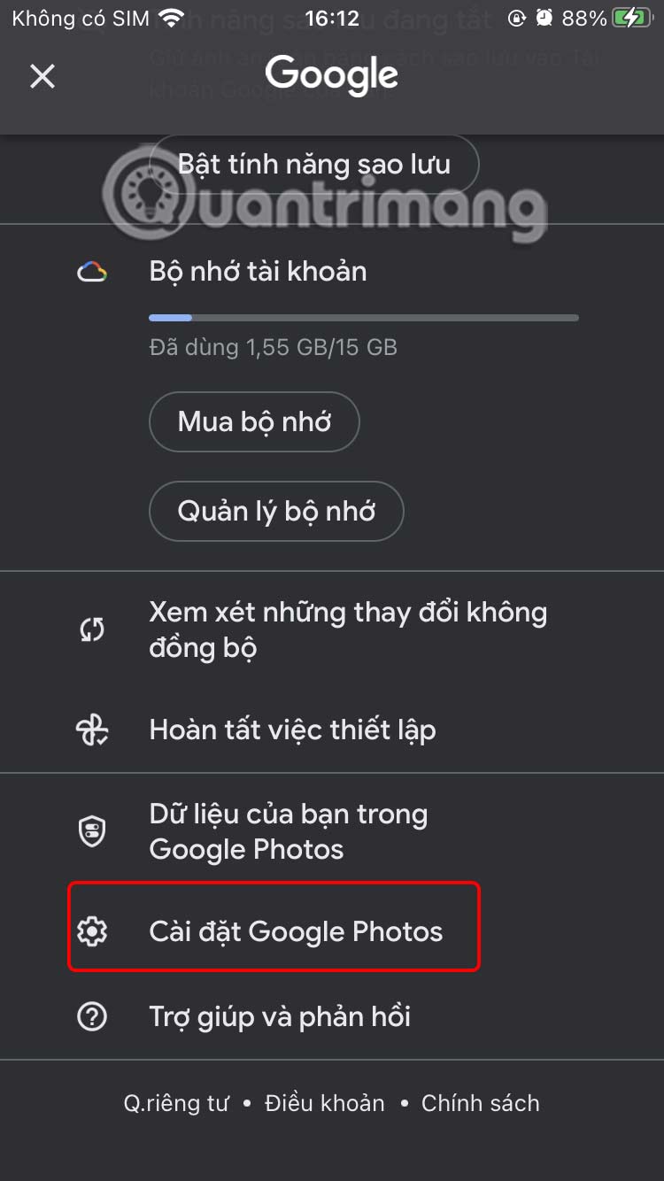 Tại giao diện trên ứng dụng Google Photos, bạn nhấn vào ảnh đại diện cá nhân. Hiển thị menu thiết lập cho Google Photos, bạn nhấn vào mục Cài đặt Google Photos để điều chỉnh.
