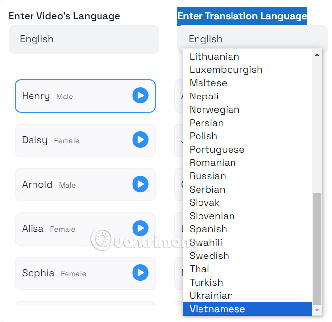 Lúc này hiển thị giao diện để bạn lựa chọn ngôn ngữ mình muốn thêm cho thuyết minh tại Enter Translation Language. Phần Enter Video's Language là ngôn ngữ giọng nói của video và bạn có thể thay đổi lại.