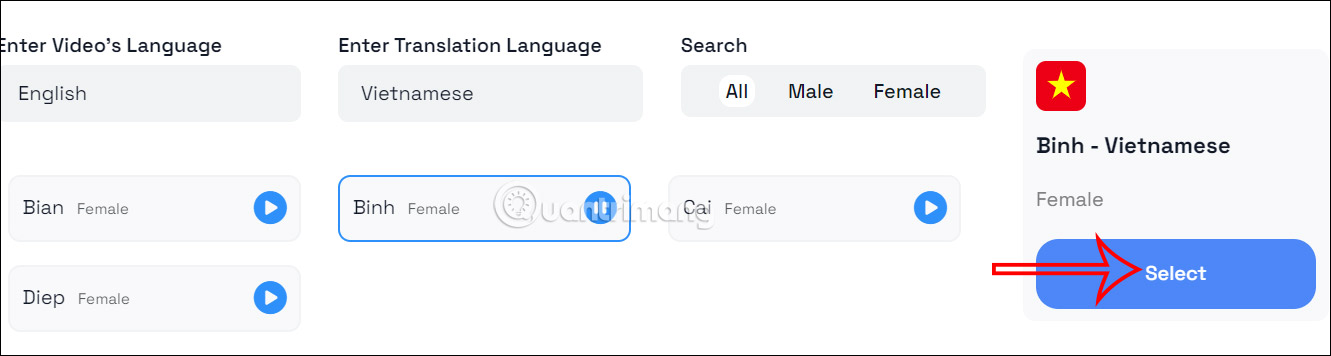 Sau đó, bạn chọn giọng đọc từ các lựa chọn bên dưới và nghe đọc thử để chọn giọng phù hợp mong muốn. Sau đó nhấn Select để xác nhận chọn.