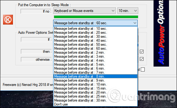 Ngoài ra công cụ còn thêm chế độ hiện thông báo trước khi chuyển sang chế độ Sleep, chờ trong khoảng thời gian nào đó trước khi vào chế độ ngủ.