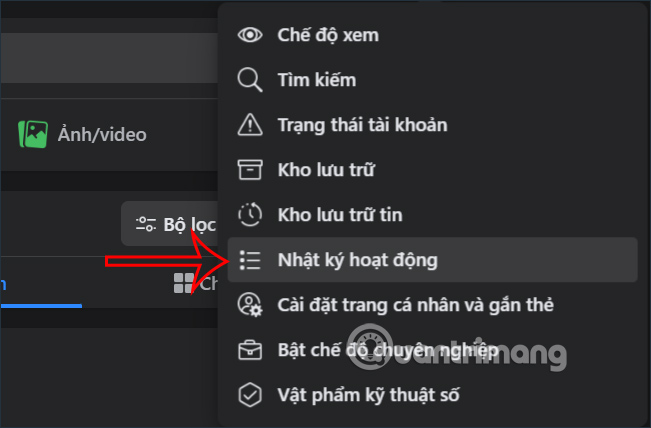 Tại giao diện Facebook trên máy tính, bạn nhấn vào biểu tượng 3 chấm rồi chọn Nhật ký hoạt động trong danh sách hiển thị.