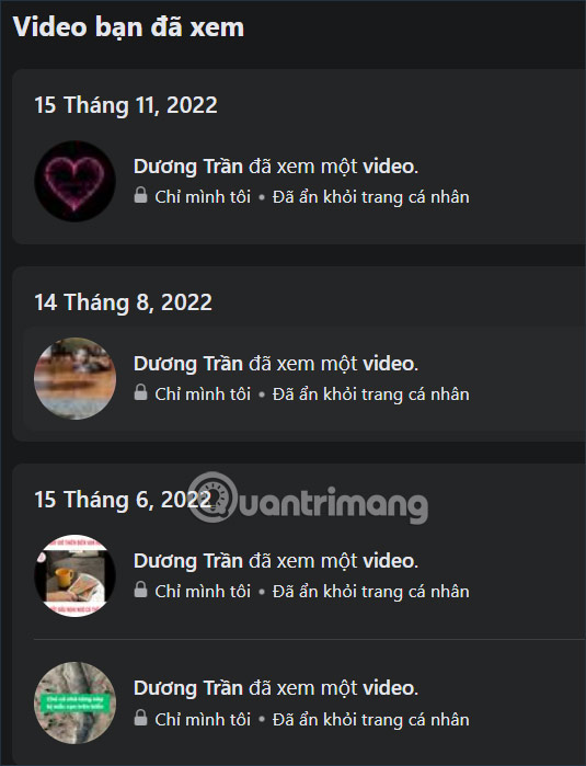 Ngay sau đó hiển thị danh sách các hoạt động trên Facebook, bạn nhấn chọn vào mục Video bạn đã xem để xem lại lịch sử những video mà chúng ta đã xem. Kết quả bạn sẽ nhìn thấy danh sách tất cả những video mà chúng ta đã xem trên Facebook như dưới đây.