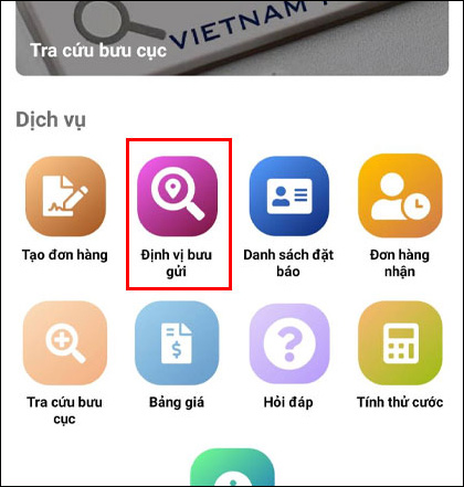 Tiếp đến tại giao diện trên ứng dụng bạn nhấn vào Định vị bưu gửi để tra cứu mã vận đơn.