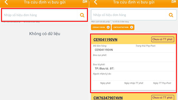 Ngay sau đó chuyển sang giao diện mới, chúng ta nhập mã bưu gửi và có thêm dấu phẩy trong trường hợp nhập nhiều mã. Sau đó nhấn biểu tượng kính lúp để tiến hành tra cứu mã đơn vận.