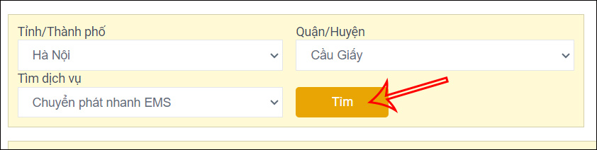 Bạn điền thông tin về thành phố, quận huyện, loại hình dịch vụ của VNPost mà mình muốn tìm kiếm bưu cục theo dịch vụ đó rồi nhấn Tìm.