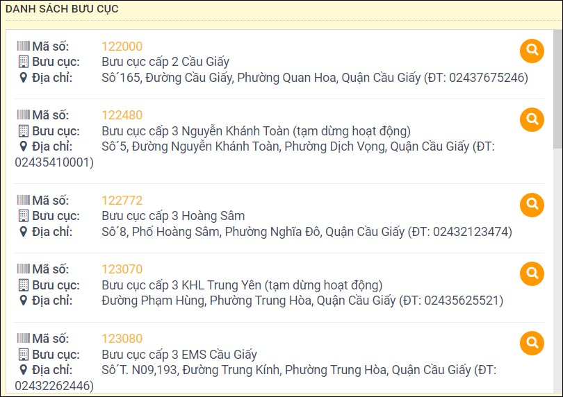 Kết quả chúng ta sẽ nhìn thấy bưu cục theo nhu cầu tìm kiếm của mình.