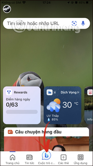 Bạn mở ứng dụng Bing AI trên điện thoại và sau đó nhấn vào ứng dụng Bing Chat ở bên dưới màn hình. Chuyển sang giao diện Bing Chat, tại đây bạn nhấn vào biểu tượng chụp ảnh ở khung nhắn tin như hình dưới đây.