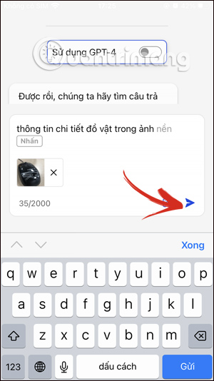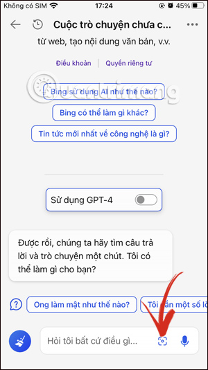 Sau khi chụp ảnh xong thì hình ảnh hiển thị trong khung chat trên Bing Chat. Chúng ta nhập câu hỏi hoặc nội dung nào về hình ảnh này rồi nhấn vào nút gửi như bình thường để nhắn tin với Bing Chat.