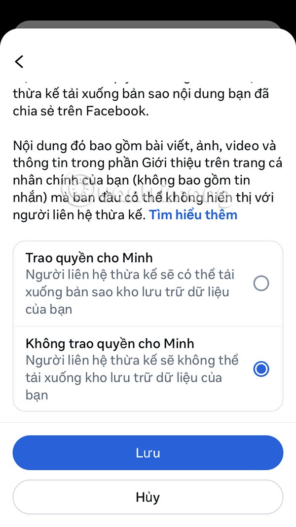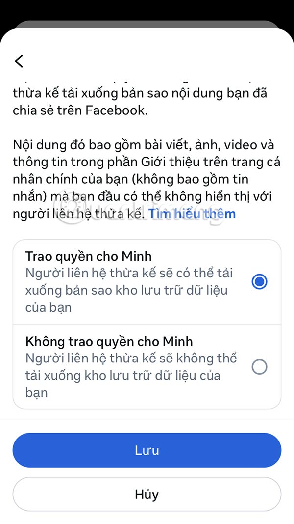 Khi chọn xong tài khoản kế thừa thì bạn chọn họ có quyền tải dữ liệu Facebook của bạn ở dạng bản sao hay không.
