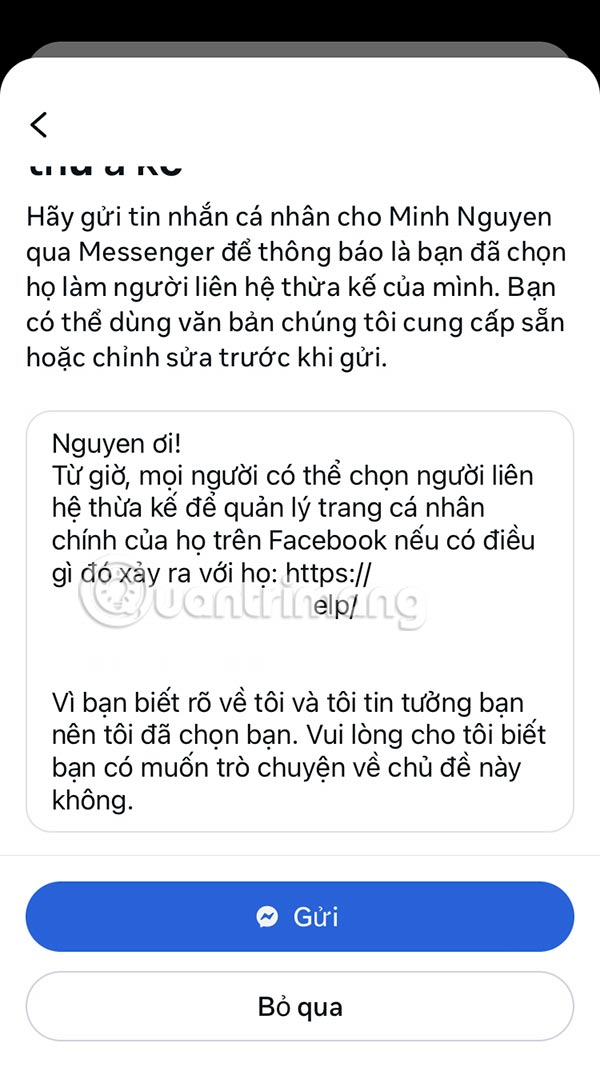 Cuối cùng gửi tin nhắn thông báo kế thừa cho đối phương, hoặc họ nhận được thông báo tài khoản. Kết quả bạn đã chọn được tài khoản Facebook kế thừa.
