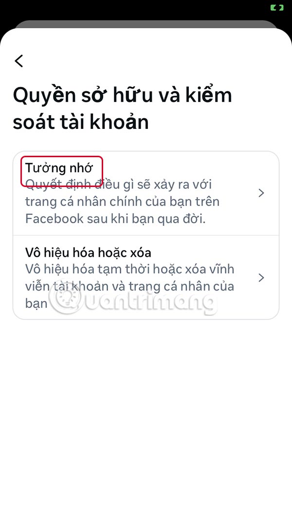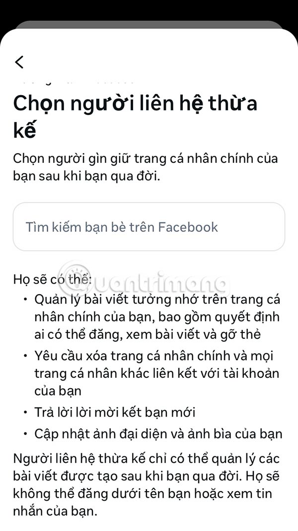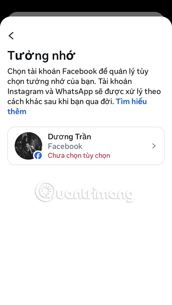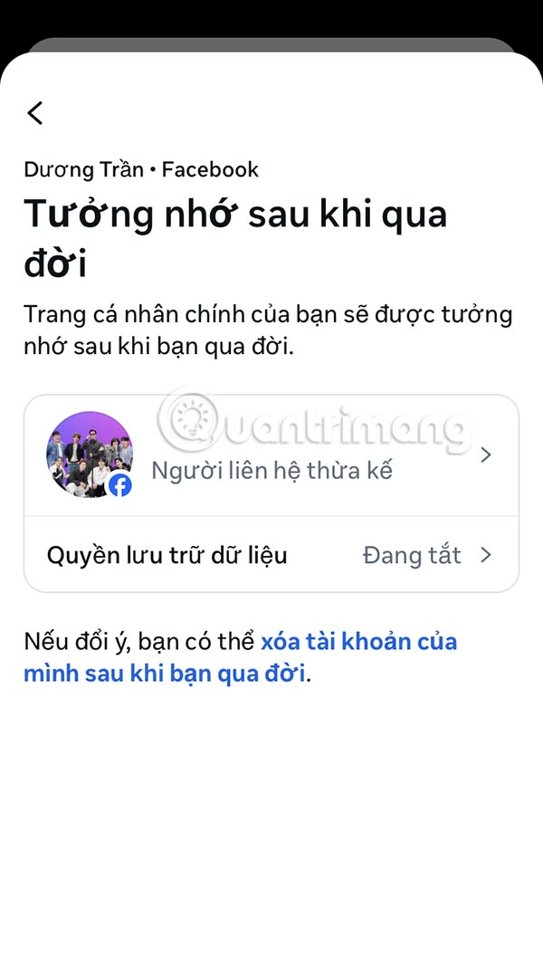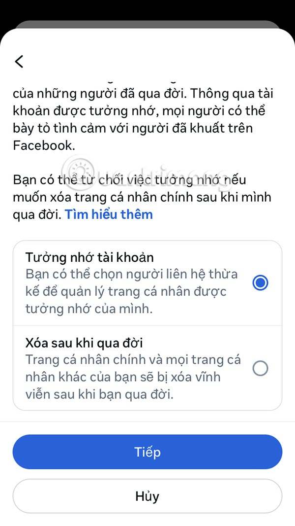 Tại đây người dùng có 2 lựa chọn là chọn tài khoản kế thừa khi nhấn Tưởng nhớ tài khoản, hoặc xóa tài khoản Facebook của bạn. Chúng ta chọn theo nhu cầu rồi nhấn Tiếp. Nếu bạn chọn tài khoản kế thừa Facebook của mình thì nhập tài khoản kế thừa vào giao diện.