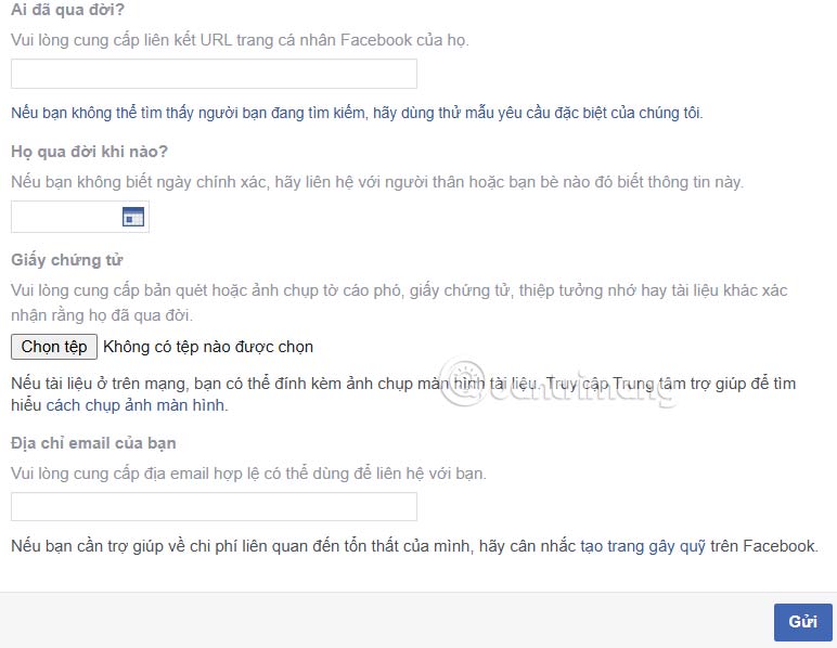 Để yêu cầu tưởng nhớ một trang cá nhân Facebook, bạn truy cập theo link dưới đây rồi nhập thông tin theo yêu cầu để gửi.