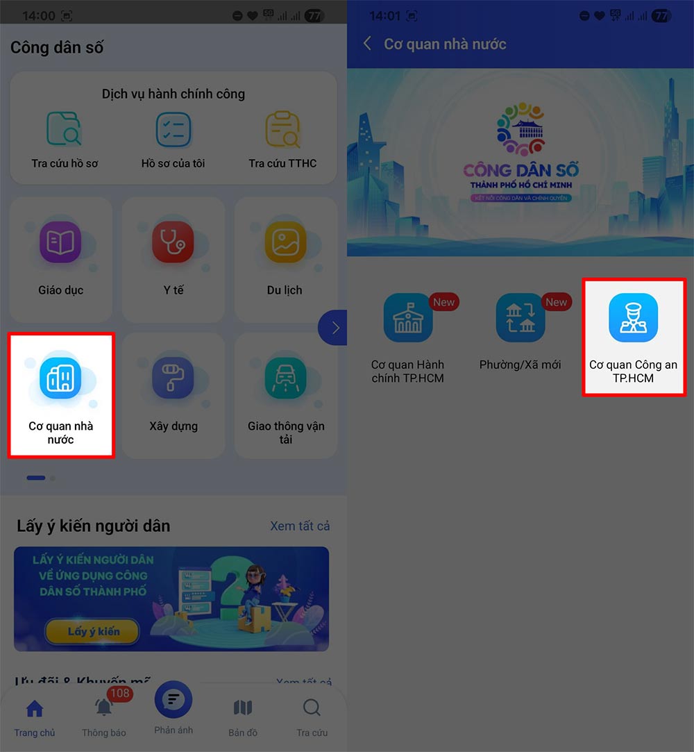 Bạn kéo xuống bên dưới rồi nhấn vào mục Cơ quan Nhà nước. Hiển thị các thông tin về Cơ quan, nhấn Cơ quan Công an TP.HCM để tiến hành tra cứu thông tin các đơn vị công an trực thuộc.