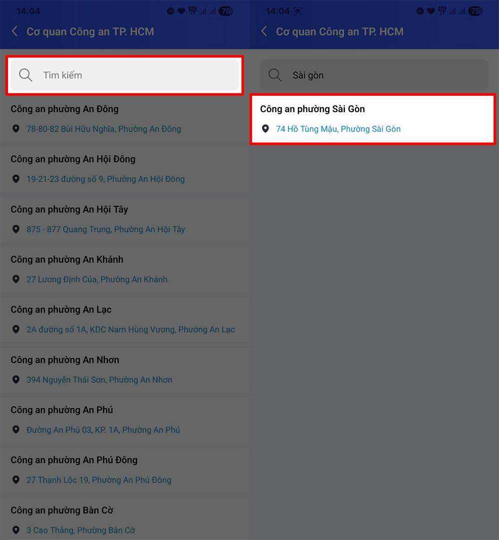 Trong giao diện mới như hình, bạn nhấn vào thanh tìm kiếm rồi nhập tên phường hoặc xã mới sau khi sáp nhập để tìm địa chỉ Công an phường/xã mới. Khi bạn nhập đúng địa chỉ sẽ hiển thị địa điểm Công an bạn cần tìm.
