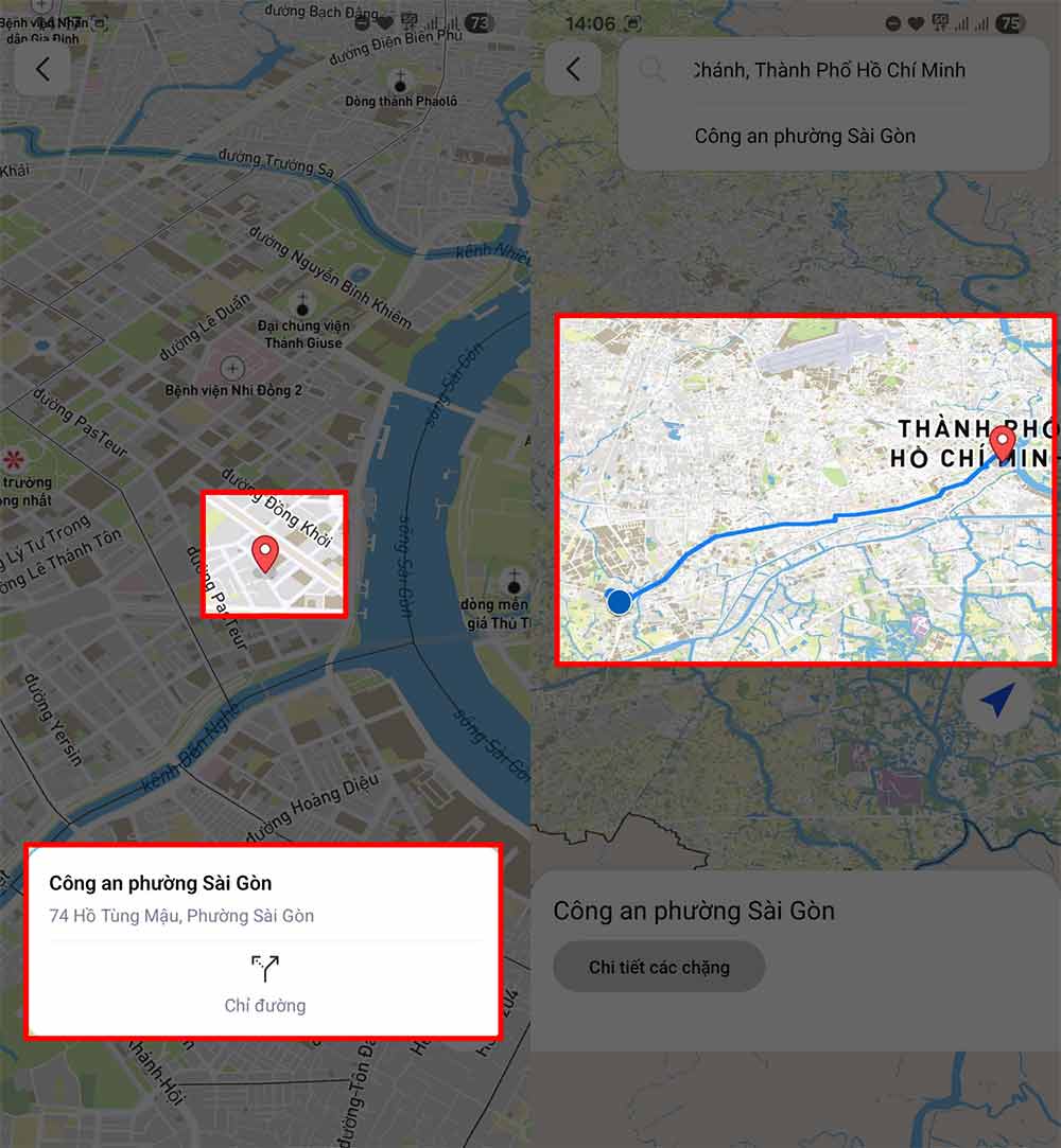 Nhấn vào địa chỉ Công an hiển thị, sau đó bạn sẽ được chuyển sang giao diện bản đồ để bạn dễ dàng tìm đường đi tới địa chỉ Công an phường, xã mới.