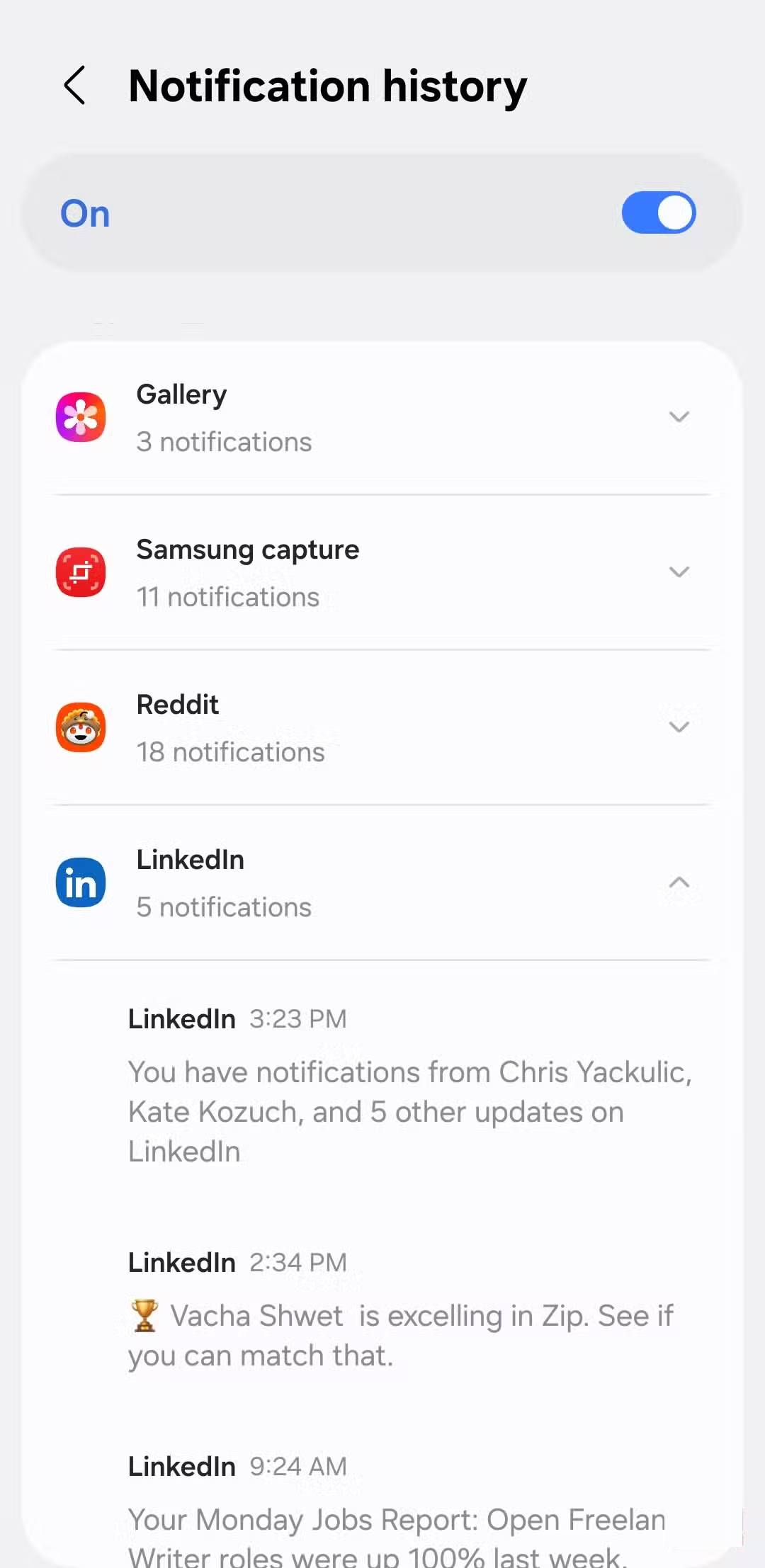 Menu lịch sử thông báo liệt kê tất cả các cảnh báo đã tắt gần đây ở trên cùng. Nếu cuộn xuống, bạn sẽ thấy danh sách các ứng dụng của mình, cùng với số lượng thông báo mà mỗi ứng dụng đã gửi trong 24 giờ qua. Bạn có thể chạm vào tên ứng dụng để mở rộng và xem tất cả các cảnh báo gần đây của ứng dụng đó.
