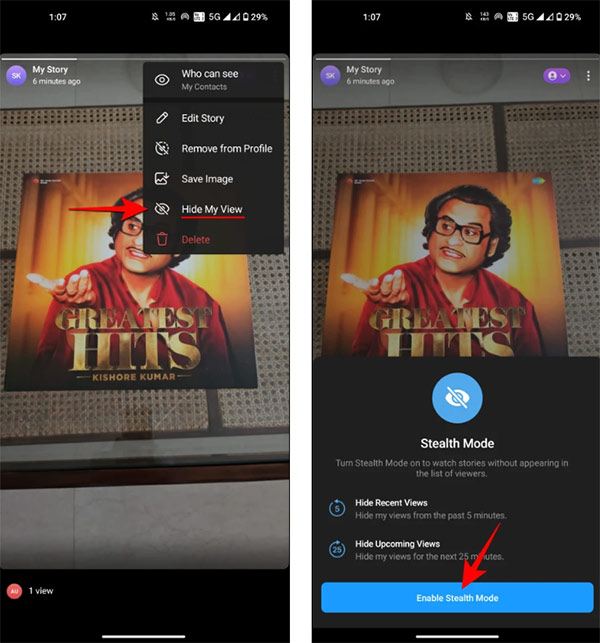 Hiển thị tùy chọn cho Story, người dùng nhấn vào Hide My View để ẩn lượt xem Story của bạn trên Telegram. Lúc này hiển thị bên dưới màn hình thông báo tính năng Stealth Mode, người dùng nhấn vào Enable Stealth Mode để kích hoạt chế độ xem Telegram Story bí mật không ai biết.