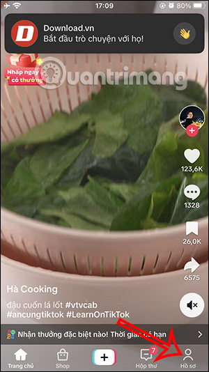 Tại giao diện trên TikTok người dùng nhấn vào mục Hồ sơ ở góc dưới cùng bên phải. Chuyển vào giao diện TikTok cá nhân, người dùng nhấn tiếp vào biểu tượng 3 dấu gạch ngang ở góc phải trên cùng.