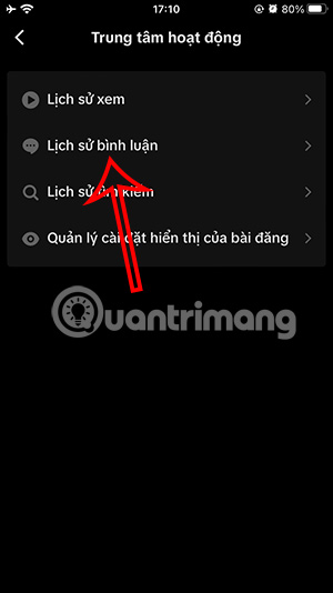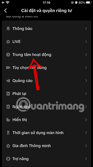 Chuyển sang giao diện các thiết lập mới cho tài khoản TikTok. Tại đây chúng ta sẽ nhấn vào mục Trung tâm hoạt động để xem lại những hoạt động của mình trên TikTok trong đó có các bình luận mà bạn đã thực hiện. Ở giao diện mới như hình, người dùng nhấn chọn vào mục Lịch sử bình luận để xem các bình luận đã thực hiện trong video TikTok.