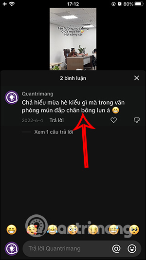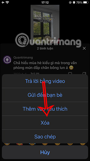 Hiển thị nội dung bình luận của bạn trong video TikTok. Để xóa bình luận TikTok trong video, chúng ta nhấn và giữ vào bình luận. Hiển thị các tùy chọn cho bình luận ở bên dưới, chúng ta nhấn vào Xóa để xóa bình luận này trong video TikTok.
