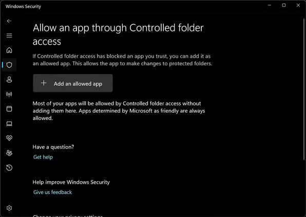 - Sử dụng tùy chọn Allow an app through Controlled folder access để đưa các chương trình đáng tin cậy vào danh sách cho phép.